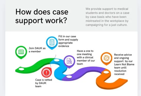 “Learn Not Blame” is DAUK’s central campaign and was launched in November 2018. Its original aim was to empower doctors to drive transformational change and challenge deeply embedded blame cultures within the NHS. For too long, systemic failings have gone unexamined while individual clinicians have carried disproportionate responsibility. High-profile cases have demonstrated the devastating impact this can have on both doctors and patients. Learn Not Blame calls for a just culture – one that addresses mistakes fairly, prioritises learning, and values the people working within the system.