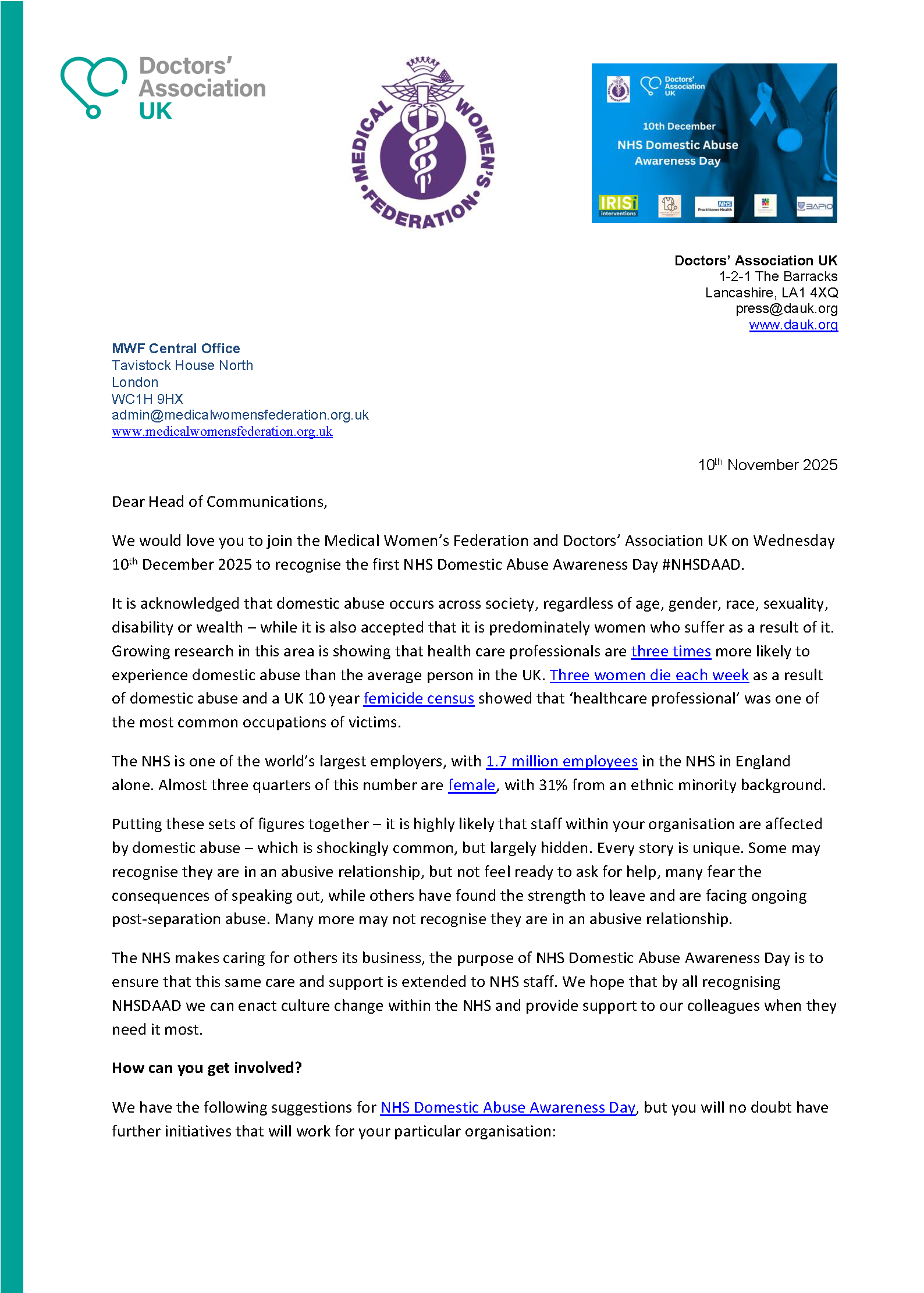 Founded by Doctors’ Association UK (DAUK) and the Medical Women’s Federation (MWF), our aim is to shine a light on the high prevalence of domestic abuse among healthcare professionals and urge NHS employers to ensure robust policies are in place so that staff facing abuse have support and safety in their place of work