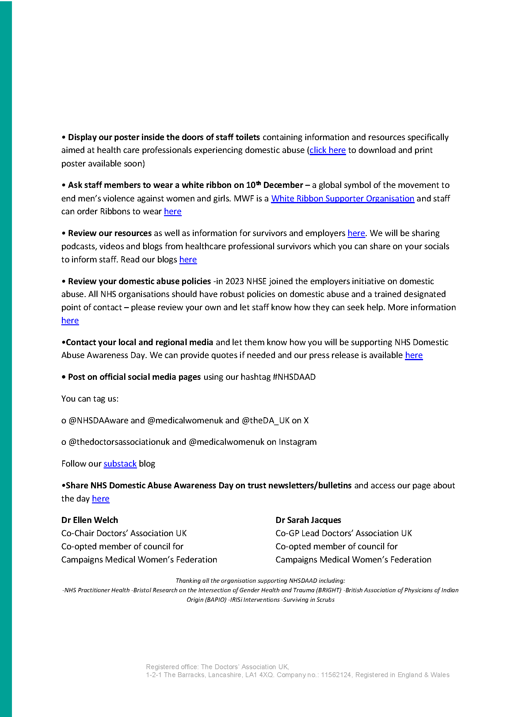 Please download a copy of our letter to NHS trusts about NHS Domestic Abuse Awareness Day and circulate it around your own NHS organisation to encourage participation