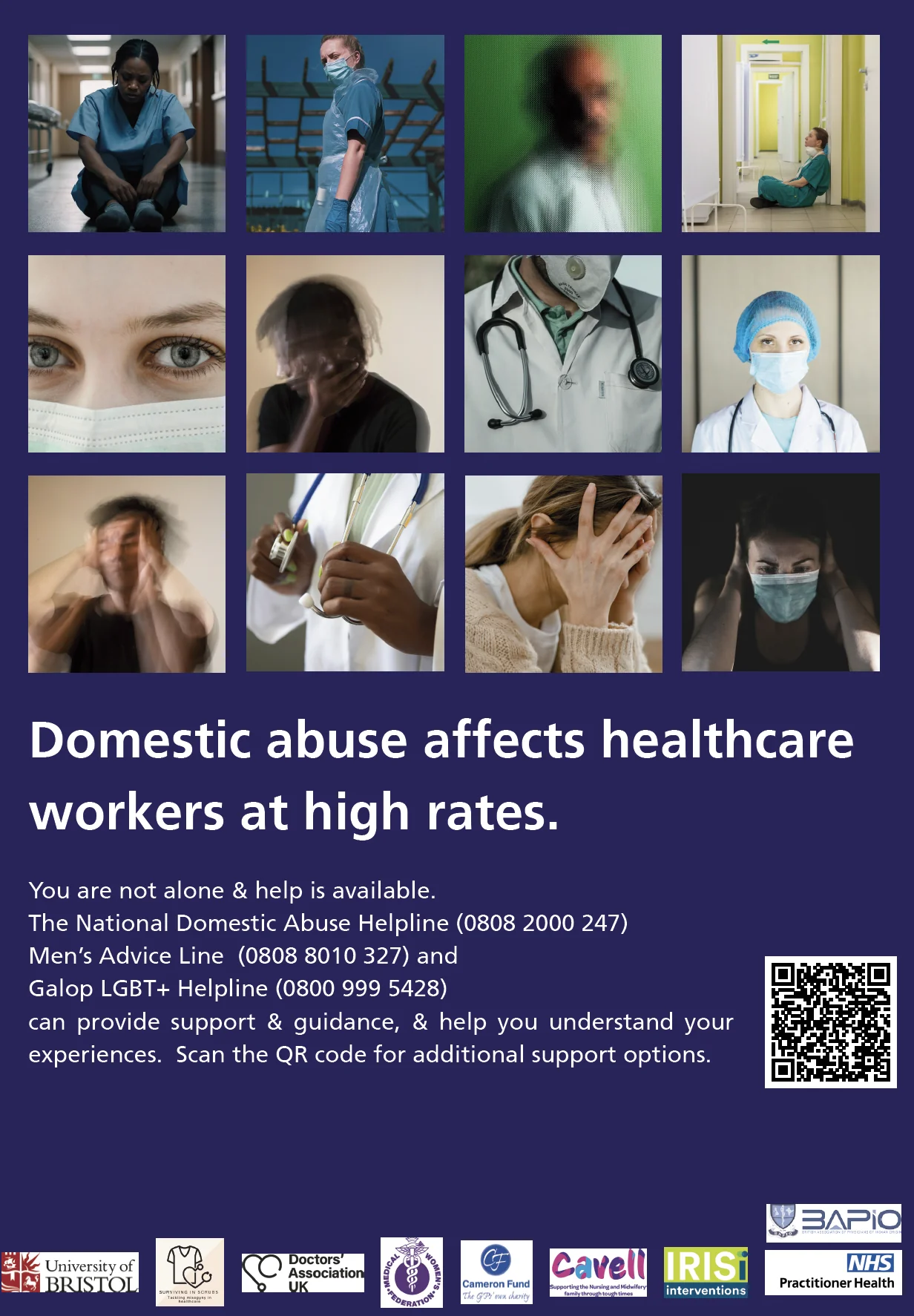 Display our poster inside the doors of staff toilets. It contains information and resources specifically aimed at health care professionals experiencing domestic abuse (scroll down to find our downloadable posters ↓)